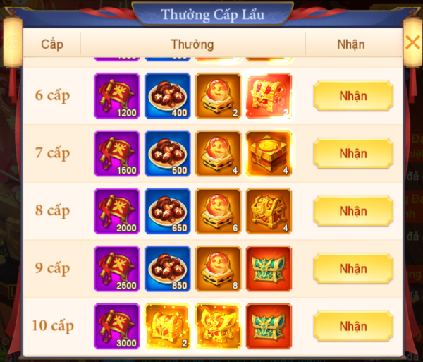 • Khi Quân đoàn đạt được đến cấp Lẩu nhất định thì tất cả thành viên trong Quân đoàn sẽ nhận được phần thưởng cấp Lẩu theo quy định.