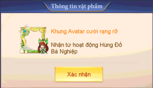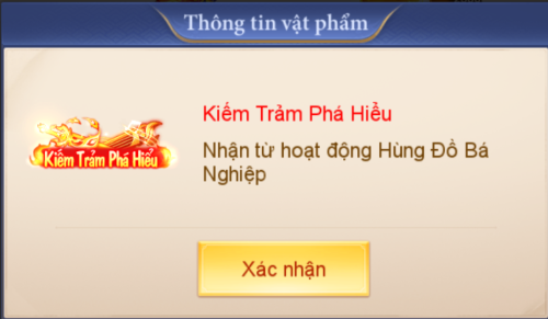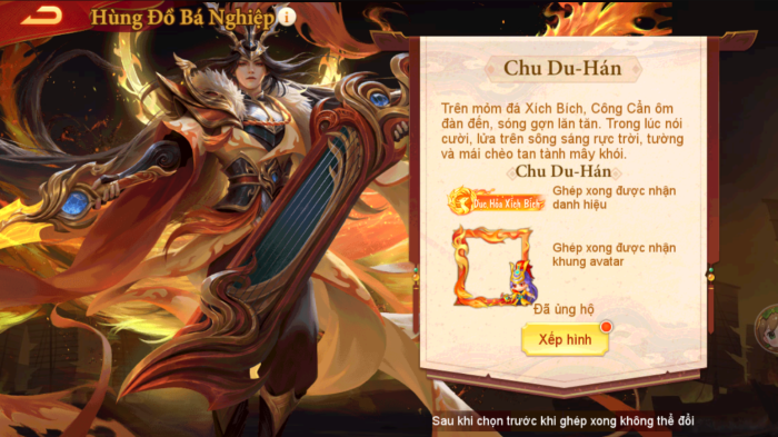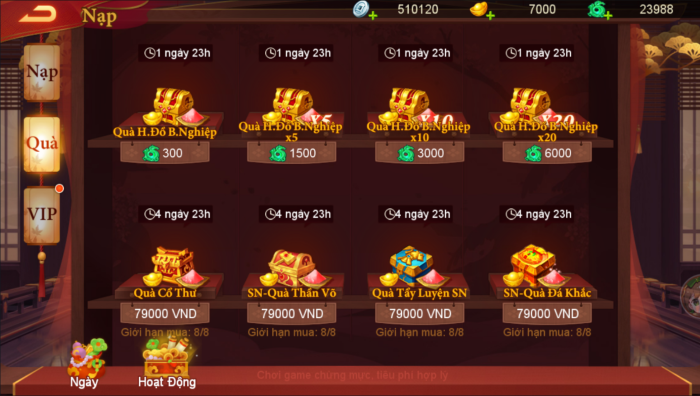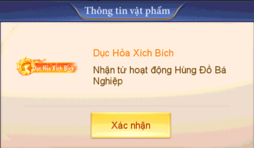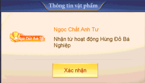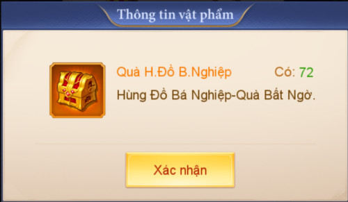 • Đối với các gói quà bán bằng Ngọc Bích sẽ nhận được rương Quà Hùng Đồ Bá Nghiệp và Màu Đỏ Thắm. Mở rương Quà Hùng Đồ Bá Nghiệp sẽ ngẫu nhiên nhận được các vật phẩm xịn như Tướng Tinh Tím Ngẫu Nhiên, Rương Chiến Quốc, Rương Chu Dịch Lễ Ký,….