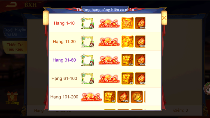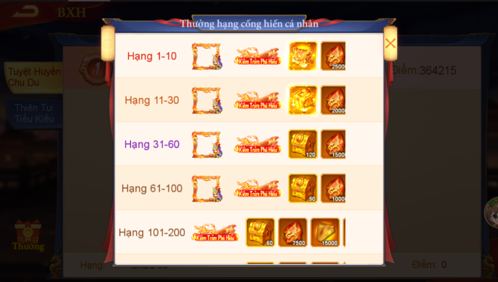 • Sau khi hoàn thành 100% tiến độ của Phe đã chọn, thưởng sẽ được gửi luôn qua thư căn cứ vào bảng xếp hạng điểm đã góp (Không cần đợi sự kiện kết thúc).