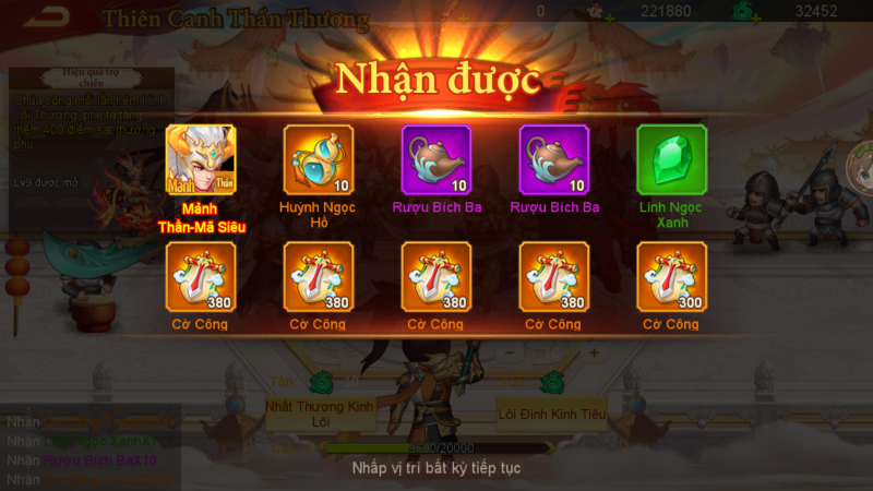 • Mỗi lần gây sát thương lên tướng địch đều có cơ hội nhận Cờ Công Trạng hoặc nguyên liệu nuôi dưỡng Kỳ Thiên Thần Mộc, khi đánh bại địch có thể nhận thêm đạo cụ .