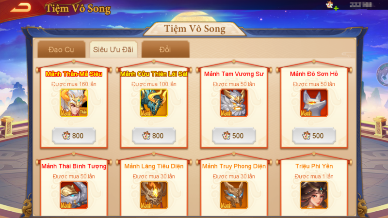 • Chúa công có xác suất nhận Phục Long Lệnh trong Thiên Canh Thần Thương, tốn Phục Long Lệnh có thể tham gia Rồng Thần May Mắn để lật bài nhận đạo cụ.