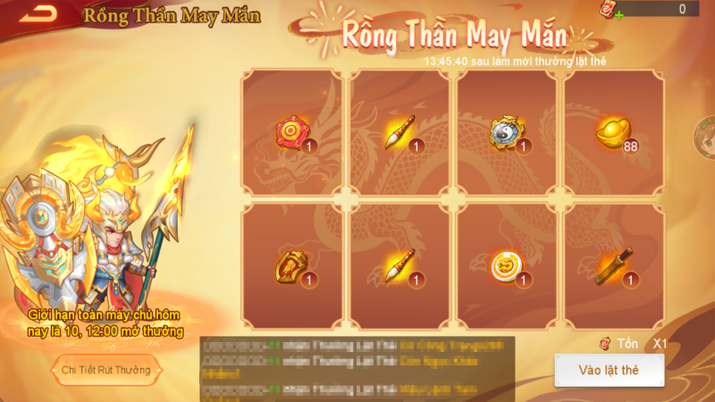 • Trong thời gian hoạt động, vào các khung giờ nhất định, hệ thống sẽ chọn ngẫu nhiên người tham gia Rồng Thần May Mắn để phát thưởng giới hạn trên toàn máy chủ, số lần lật bài càng nhiều thì xác suất trúng thưởng càng cao.