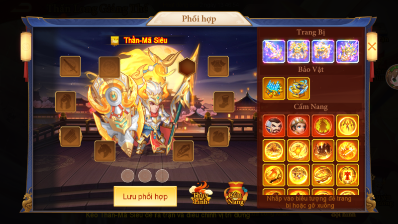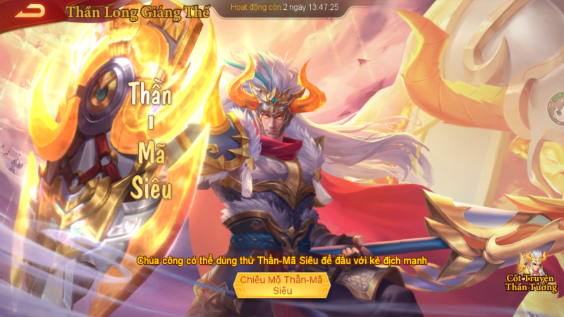 • Chúa công có thể chiêu mộ và dùng thử Võ Tướng Thần-Mã Siêu, chọn đội hình thử nghiệm để đối chiến với kẻ địch mạnh.