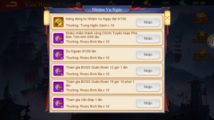 • Trong Bày Mưu Tính Kế có thể tốn Trung Ngôn Sách hoặc Ngọc Bích để giao đấu với võ tướng, hoàn thành Nhiệm Vụ Ngày và Thành Tựu có thể nhận Trung Ngôn Sách.
