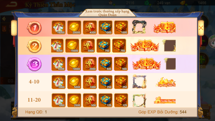 • Trong thời gian hoạt động, EXP bồi dưỡng Kỳ Thiên Thần Mộc sẽ tích lũy theo đơn vị quân đoàn và xếp hạng toàn máy chủ, khi kết thúc quân đoàn có tên trên BXH sẽ nhận thưởng hạng tương ứng.