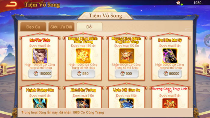 • Cờ Công Trạng có thể đổi đạo cụ tại Tiệm Hoạt Động. Nguyên liệu có thể dùng nuôi dưỡng Kỳ Thiên Thần Mộc, giành thêm thưởng cùng với hảo hữu quân đoàn.