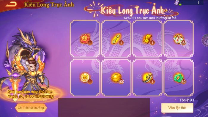 • Trong thời gian hoạt động, vào các khung giờ nhất định, hệ thống sẽ chọn ngẫu nhiên người tham gia Rồng Thần May Mắn để phát thưởng giới hạn trên toàn máy chủ, số lần lật bài càng nhiều thì xác suất trúng thưởng càng cao.