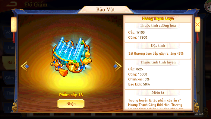 • Đặc tính: ST trực tiếp gây ra tăng 24% - Bảo Vật không thể thiếu của Trương Giác-Hán hay các tướng Meta như Quan Vũ-Hán, Tào Phi-Hán để gây hàng tấn sát thương.