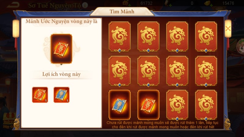 • Tìm Mảnh: mỗi ngày chỉ có thể tham gia 1 lần, làm mới vào lúc 4:00 hàng ngày. Khi bắt đầu, người chơi có thể chọn Tham gia miễn phí hoặc Phúc Duyên Gia Trì. Cần chọn trước 1 Mảnh Nguyện Ước, sau đó tiến hành rút trong khu vực mảnh bên phải. Nếu rút trúng Mảnh Nguyện Ước, Chúa Công được lật tiếp một mảnh nữa cho đến khi rút phải mảnh không phải Nguyện Ước hoặc rút hết toàn bộ mảnh trong kho mới kết thúc.