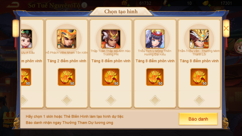 • Sau khi mở đăng ký, Chúa Công có thể chọn hình tượng đã mở khóa để tham dự (không nhất thiết phải giống với hình tượng hiện tại). Nghe nói hình tượng càng lộng lẫy thì càng tốt đó nha.