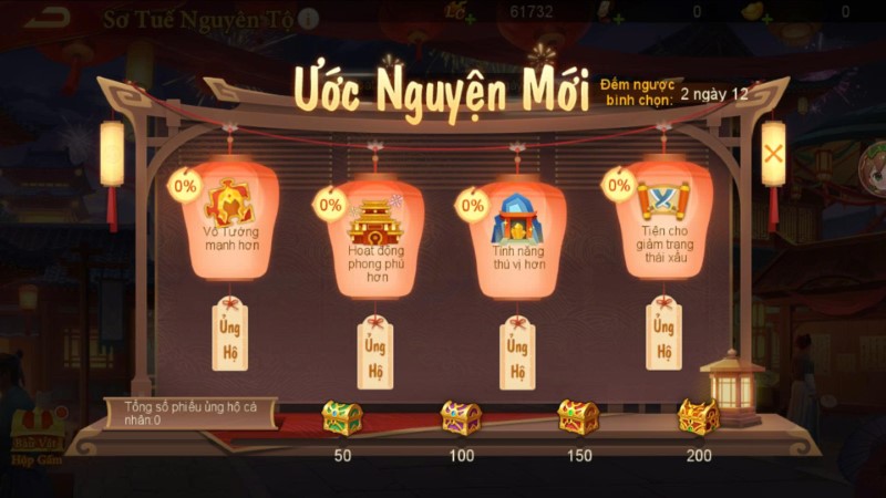• Chúa Công có thể tiêu hao Thẻ Cầu Nguyện để ủng hộ Lồng Đèn Cầu Nguyện yêu thích. Vào lúc 23:00 ngày thứ ba của sự kiện sẽ tiến hành tổng kết, những Chúa Công đã tham gia sẽ nhận được Hộp Quà Bất Ngờ làm phần thưởng.