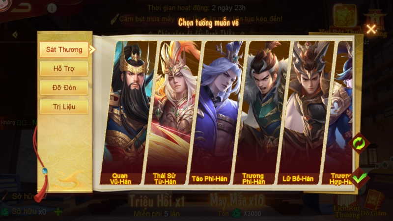 Trả lời: Có. Tại giao diện quay Tướng Hán, Chúa công có thể tùy chọn tướng mình muốn quay trừ tướng Hán Tào Tháo và Lưu Bị.