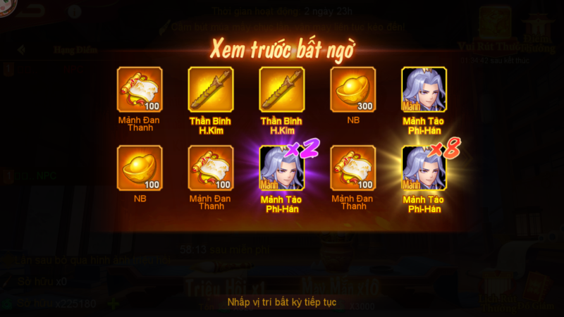 • Khi rút thưởng x10 ở Thiệp Tuấn Kiệt và Thiệp Anh Hào sẽ có cơ hội nhận thưởng Hồng Vận, mảnh tướng nhận được có khả năng nhân đôi.