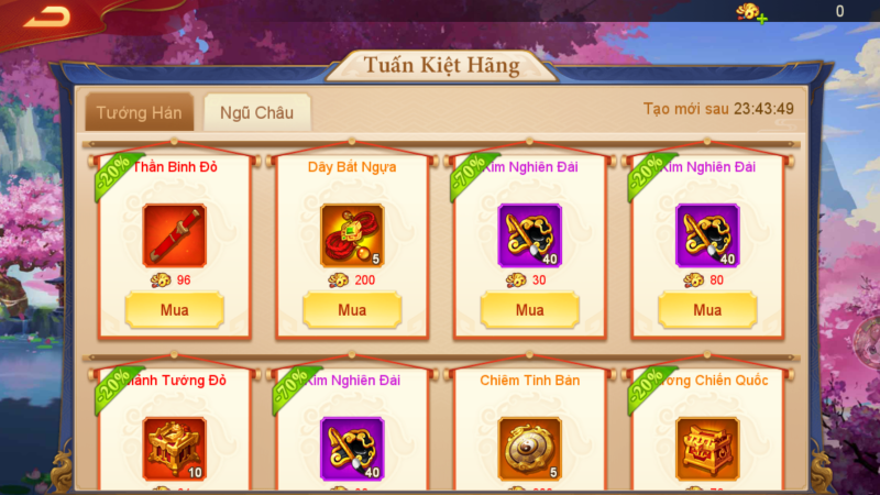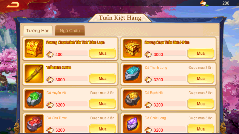 • Tiệm Tướng Hán chỉ đổi được bằng Đan Thanh (vật phẩm nhận được tại Event Quay Tướng Hán).
