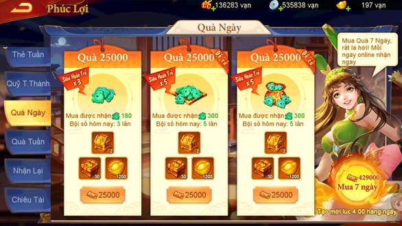 Mỗi ngày khi mua các gói quà ngày sẽ có cơ hội nhận thêm Ngọc Bích với tỷ lệ hoàn trả ngẫu nhiên lên đến 1000%.